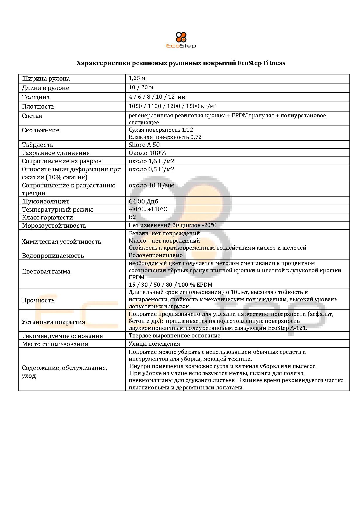 Покрытия поставляются в рулонах по 10 м, 20 м, имеют толщину от 4 до 12 мм и плотность от 650 до 1200 кг/м. Цвет покрытия зависит от количества цветной каучуковой крошки по выбору заказчика. Сегодня многие спорткомплексы, фитнес-клубы, ледовые арены останавливают свой выбор на универсальном покрытии EcoStep Fitnes. Рулонные резиновые покрытия EcoStep Fitness – это готовые спортивные покрытия в рулонах, которые обладают такими необходимыми свойствами как: хорошая амортизация, отличное сцепление с подошвой, шумо- и вибропоглощение, прочность, долговечность, устойчивость к большим нагрузкам, высокие декоративные качества. А такие свойства EcoStep Fitness как нескользящая поверхность, способность сохранять тепло необходимы для покрытиq вокруг бассейнов, в аквапарках, для палуб, причалов и других поверхностей, постоянно контактирующих с водой.