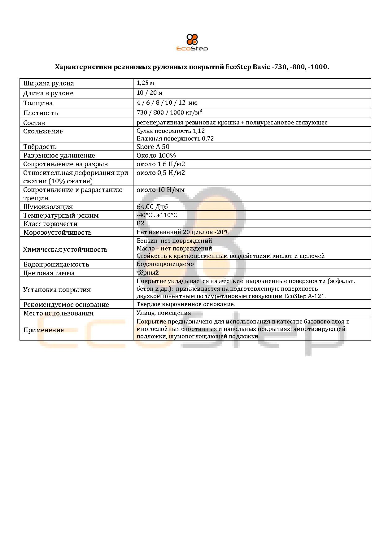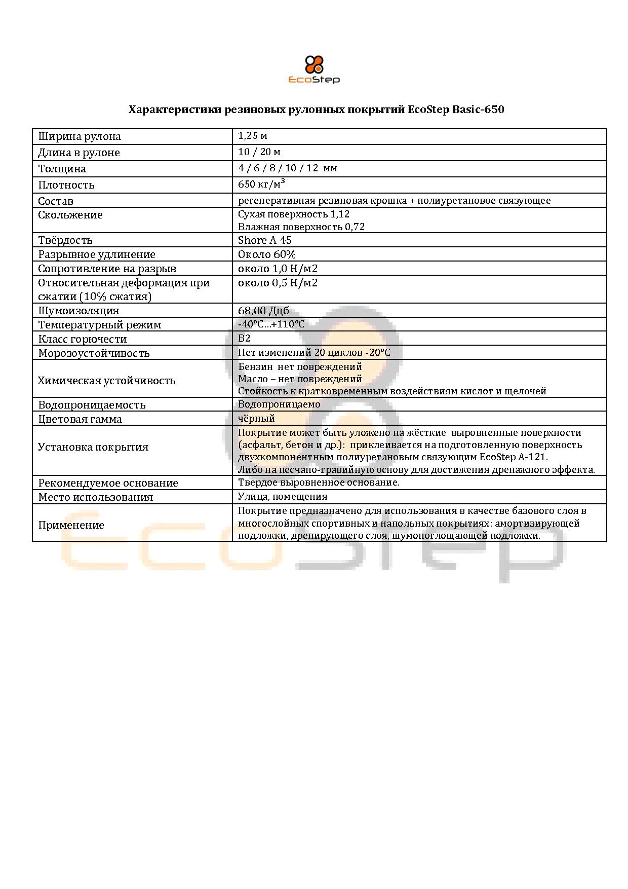 Резиновую подложку EcoStep Basic.используют в качестве амортизирующего слоя в системе многослойных спортивных покрытий. Подложка имеет чёрный цвет и поставляется в рулонах на паллетах по 10 м, 20 м, имеют толщину 4 -12 мм и плотность 650, 730, 800 кг/м. EcoStep Basic укладывается на основание и выполняет функции базового амортизирующего слоя, обеспечивает хороший отскок мяча, снижает нагрузку на суставы спортсменов, поглощает шум и вибрации. Финишное покрытие на резиновую подложку выбирается исходя их требований и функционального назначения покрытия: спортивный паркет, бесшовное покрытие из резиновой крошки, наливное полиуретановое покрытие, искусственная трава. Рулонные резиновые покрытия востребованы и при устройстве полов вокруг ледовых арен, для обустройства коридоров, раздевалок, спортивных трибун и других полов, испытывающих существенные нагрузки. Покрытия EcoStep не рвутся коньками, не требуют особого ухода, радуют глаз и служат на протяжение долгого времени.